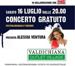 Sabato 16 luglio 2011 vi aspetta il Festivaldichiana, festival dedicato a shopping, musica e spettacolo giunto alla sesta edizione, che si svolge all’interno dell’Outlet Village Valdichiana. Dalle ore 20 concerto gratuito con Francesco Renga, Anna Tatangelo, Airway, Btwins, Gemelli Diversi, Matia Bazar. Conduce Alessia Ventura. Negozi aperti fino a mezzanotte. Buon divertimento!